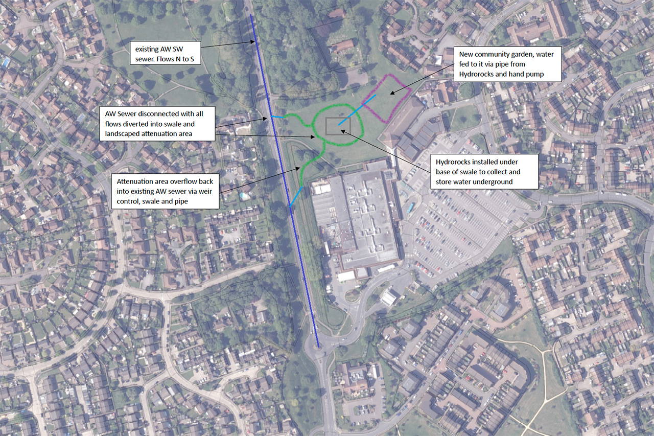 As part of this project we hope to use innovative rainscaping techniques to direct and store water within the highway and green open space areas around the St Mary’s Nature Reserve and behind Asda. A series of accessible boardwalks will be used to allow access throughout the rainscaped areas. Rainwater captured will be stored and – once treated using nature-based solutions – can be used to water the new community garden areas to be installed, or by our parks team to water the many green open spaces in the area.